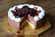 A visually enticing chocolate cake with strawberries and cream, perfect for desserts and celebrations.